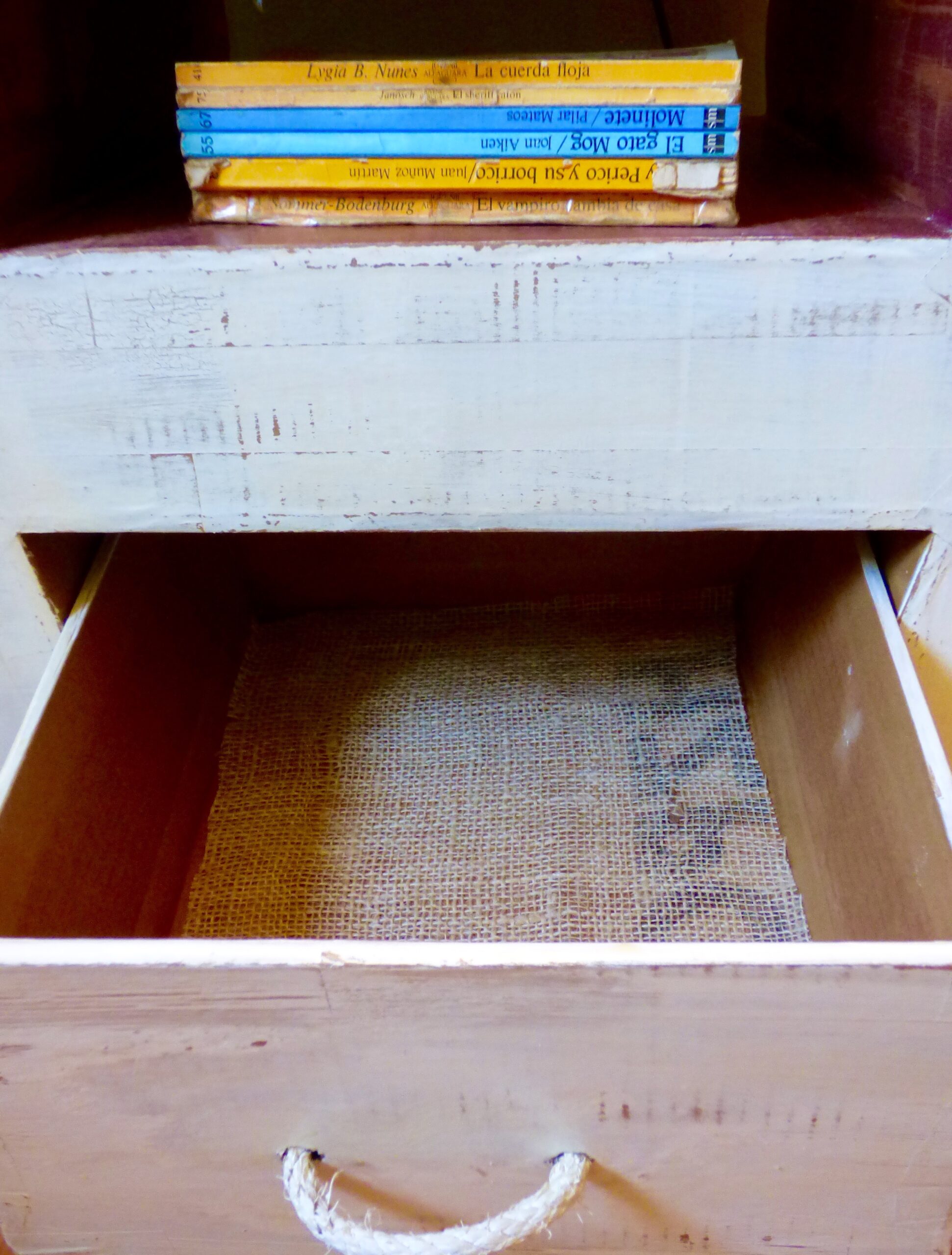 Con sus craquelados, decapados y desconchones… con sus marcas imitando el paso del tiempo… hasta con su tirador hecho con un trozo de soga… más rústico imposible!