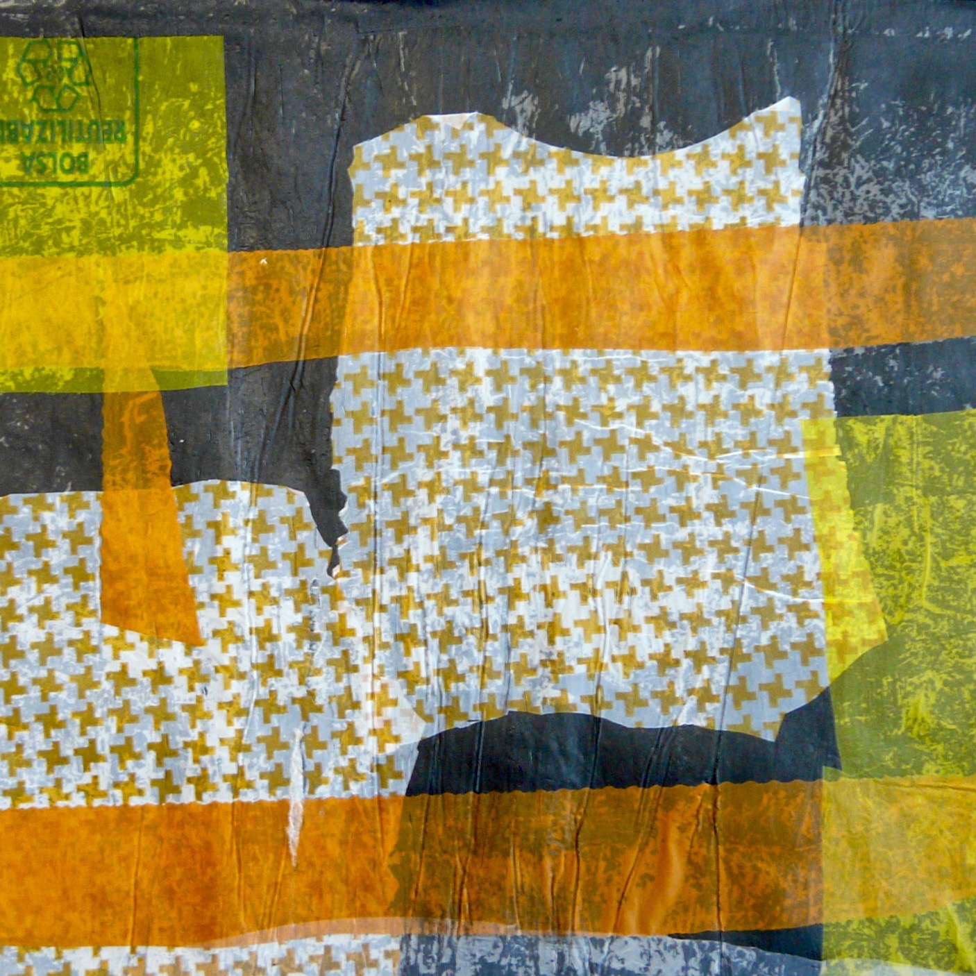 Luego están las bolsas de colores que son nuestro bien más preciado y que no abundan tanto. De estas sólo usamos una fina capa encima de las bolsas blancas para dar color a la lámina. Muchas veces jugamos con la transparencia propia de estas bolsas y hacemos nuestros propios estampados incluyendo cosas locas como pinturas de cera, las redes de los ajos… no sé, nos gusta experimentar 🙂